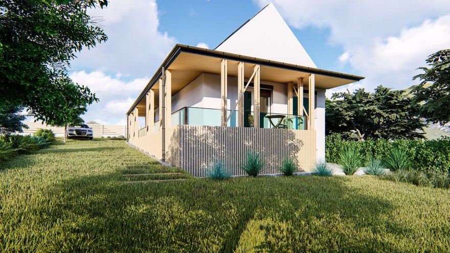Programterv: 2235 Mende. Erdőszéli lejtős telken lévő “présház” újragondolása egy fiatal házaspár számára.Megnevezés: